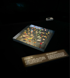 Children’s world peace monument with donated cranes from all over the world displayed below and the case holding some of the original cranes made by Sadoka