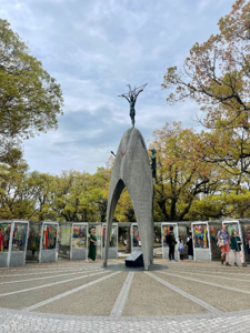 On our trip to Hiroshima the illness and great faith of another young girl was central to our visit to the memorial peace garden. Sadoka Sasaki was two years old and only two kilometres away from where the bomb dropped in Hiroshima. Many of her neighbours died but she apparently was uninjured, however some 10 years later Sadoka became very tired and ill, this worsened until eventually she was admitted to the Red Cross hospital where she was diagnosed with leukaemia – known as the A-Bomb disease with a very low survival rate – she was, not surprisingly, very scared. During her stay in hospital her best friend Chizuko came to visit and brought a gift of origami paper – she told her of a legend regarding the crane -the sacred bird in Japan which is believed to live for 100 years, it was said if someone folds 1000 paper cranes their wish would come true. Sadoka committed herself to fold one thousand cranes and prayed for her recovery – even during times of great pain she would continue folding using any scrap of paper she could find often using the paper wrapping from her medication – in the 8 months she was hospitalised she became known to all patients and staff continuing to raise the spirits of those around her with her cheerful and optimistic manner – even though she knew by then she would not survive. She died in October 1955 and is believed to have made over 1400 paper cranes – some of which are still on display in the Peace museum. After her death her school friends decided to form a club to honour her and students from her school, other schools in the area and nine other countries raised money to build a statue to recognise the many children who lost their lives because of the bomb. Children continued making the paper cranes, and still do, in her memory. In May 1958 almost three years after she died enough money was collected to build the monument which is now in Hiroshima peace park close to the spot where the atomic bomb was dropped – that act of folding cranes turned into a national and then an international children’s peace movement – children from all over the world still send folded paper cranes to be placed in cabinets beneath Saduka’s statue and in doing so they help to fulfil the wish engraved on the base of the statue – ‘This is our cry, this is our prayer, peace in the world’