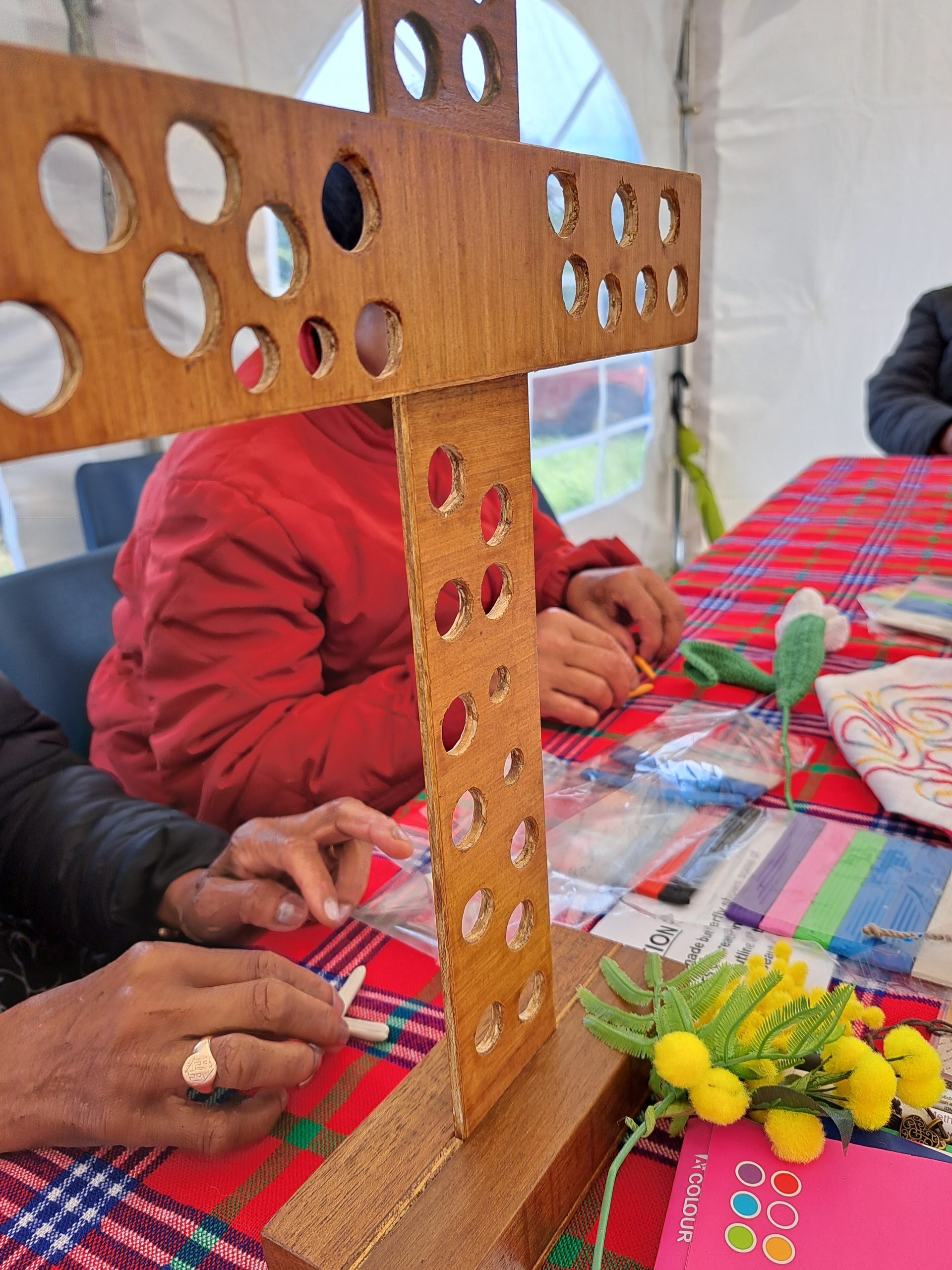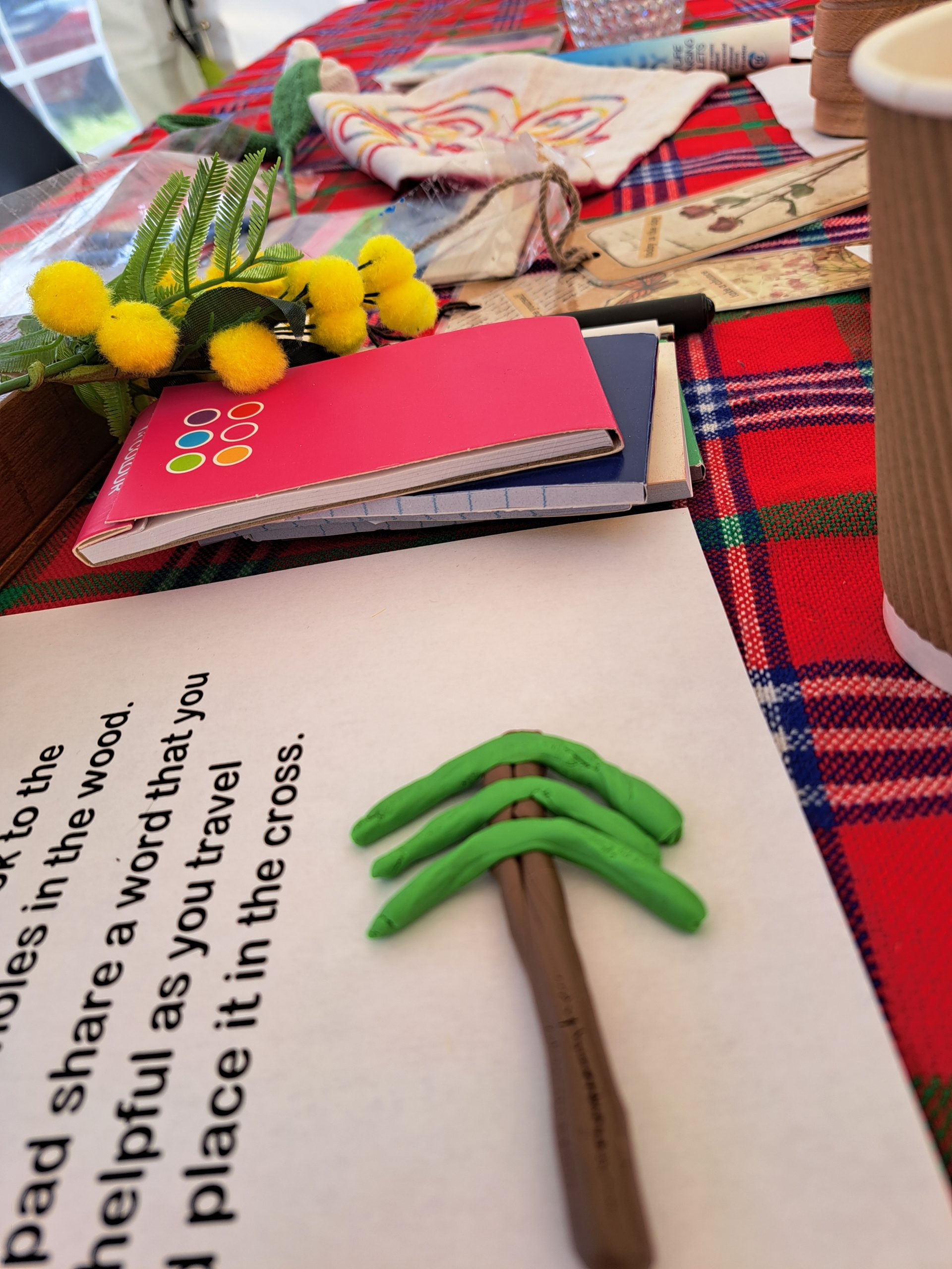 I was pleased to be there to run a prayer station workshop on behalf of MWiB after the walk and picnic lunch. The weather, though, had other ideas as high winds and very heavy rains disrupted proceedings as we all huddled in the chapel and gazebos to try to find shelter .I was able to do an adapted workshop in the corner of the large gazebo but some events were cancelled for health and safety reasons. It was lovely to meet around a table with a group who had travelled from London to take part .We shared about prayer, prayer requests and prayer prompts and also experimented with how we could make or find prayer prompts from things around the home.