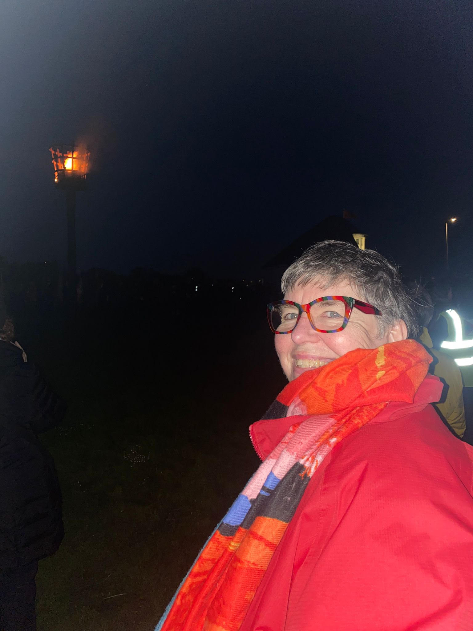 Finally the deputy mayor moved further round the beacon and tried yet again and after an anxious wait a tiny puff of smoke rose up from the beacon but still no fire. Then a sudden change in wind direction and the beacon blazed brightly lighting up the night sky . It was a very atmospheric moment. As everyone made their way back down the hill with the beacon blazing the words of the hymn” Longing for Light we wait in darkness” was buzzing in my head “Christ be our light ..shine through our hearts shine through the darkness” The patience and dignity of the deputy mayor waiting for the beacon to light and the power of the beacon joining all the other beacons across the country spoke volumes about the power of community in difficult times.