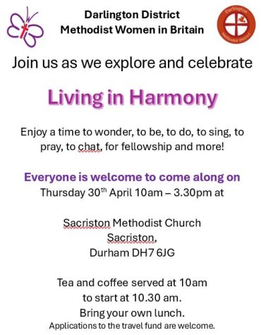 in NEWS & EVENTS, District news onDarlington District Methodist Women in Britain Join us as we explore and celebrate Living in Harmony Enjoy…